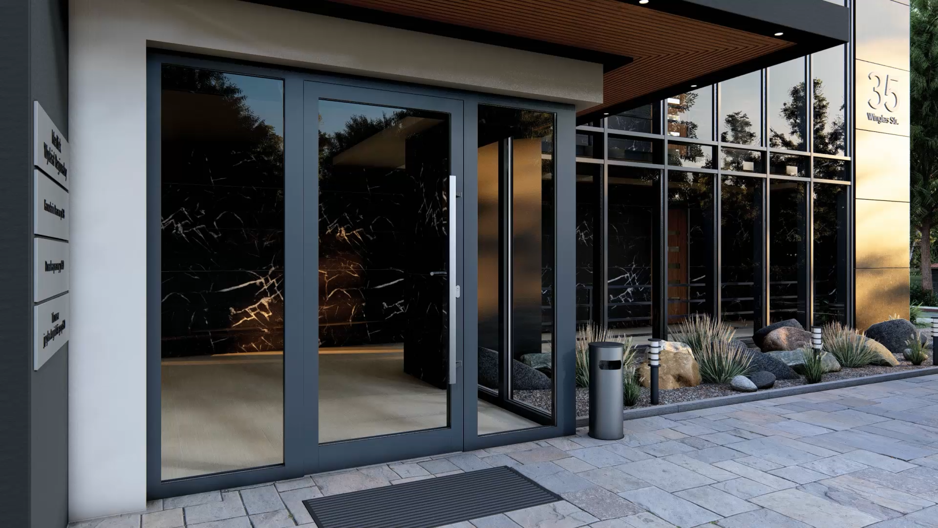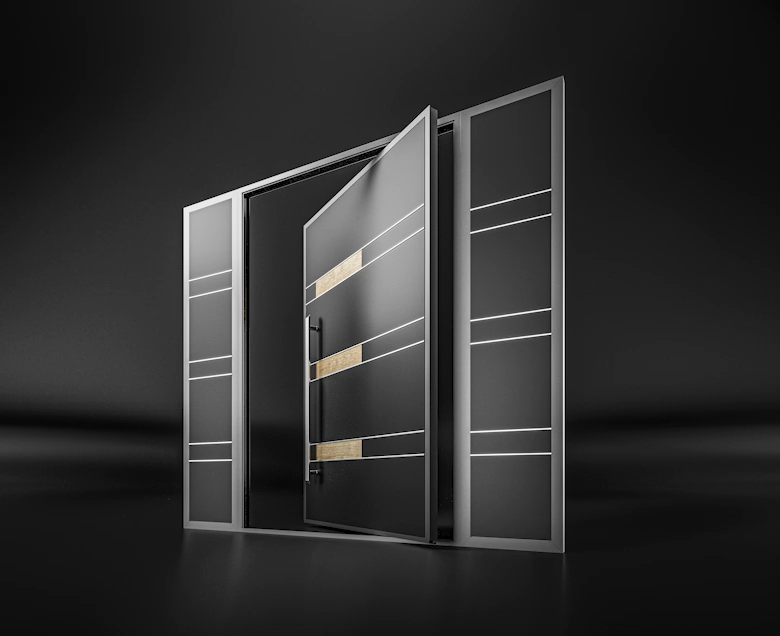 A pivot door for external installation, whose main features are its large dimensions and unusual design. The offset pivot axis gives them a unique appearance and the concealed hinges are characterized by a very high load capacity.